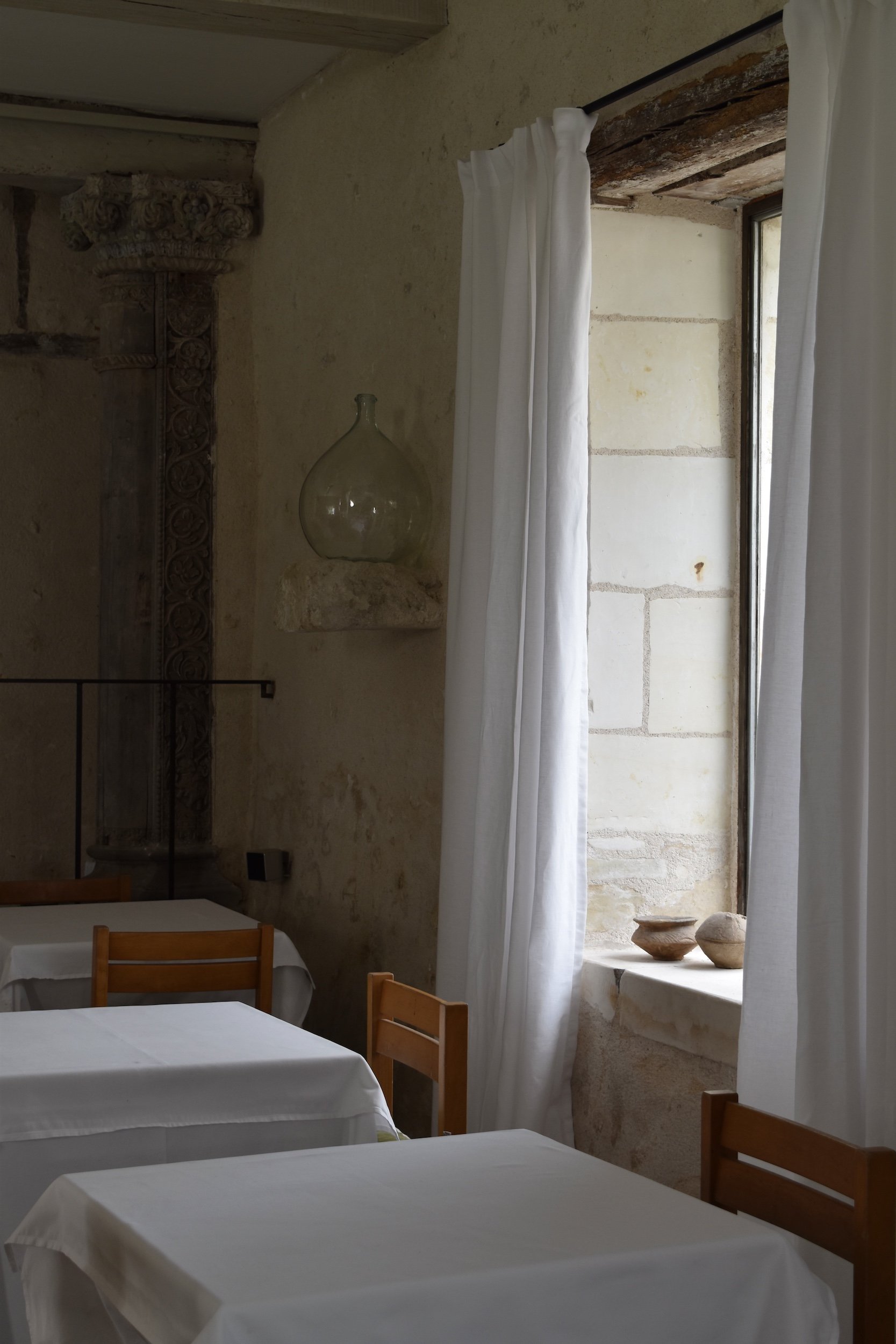 Against this raw backdrop, linen curtains, white tablecloths, soft furnishings and a crystal chandelier provide gentle contrast.
